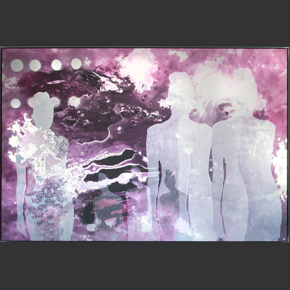 Schramms artistic technique is digital painting, which she has developed into something unique with the knowledge gained from painting. The motif is printed onto a metal plate by means of a special, complex process, whereby a Coexistence between substrate and paint is created. The interplay between matt and shine makes the viewer literally feel the material and figurative and characterizes her impressive unique pieces. Symbolically, in order to preserve the ephemeral, this work was “weightily” framed in industrial iron.